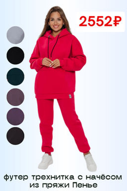 Представляем женский спортивный костюм фабричного производства от lovetex.store. Для изготовления изделия используется высококачественный теплый, мягкий трикотажный футер трехнитка с начёсом из пряжи Пенье. Идеально подойдет как для женщин, так и для мужчин. Комплект состоит из базового удлиненного худи с карманом кенгуру, с опущенной линией плеча и объемным капюшоном, а также из брюк с высокой посадки на мягкой резинке (джоггеров) с глубокими, аккуратными карманами в боковых швах. Манжеты и низ худи выполнены из рибаны. Умеренный свободный оверсайз на флисе согреет Вас в холодную, прохладную погоду. Костюм идеально подойдёт на осенний и зимний сезоны. Демисезонный костюм можно надеть с жилеткой, футболкой, топом, или просто надеть под низ бесшовное белье и вязаный топик. Наденьте на спорт, уличный фитнес, футбол, тренировки, для йоги, бега, фигурного катания, сноуборда, на тренажеры. Молодежную модель можно надеть на футбольный, лыжный матч, для дома и дачи. Подойдет для девочки как физкультурная школьная форма на физкультуру в школу или домашний комплект. Повседневный или туристический образ дополнит легкий тонкий жилет или походная куртка, шапка, шерстяной вязанный защитный от ветра шарф. Мягкие широкие флисовые штаны можно заменить на обтягивающие лосины, велосипедки, палаццо, клеш, кюлоты, джинсы и получится новый стильный образ. Из обуви подойдут кроссовки, берцы, ботинки на массивной подошве. Футер отлично пропускает воздух и впитывает влагу, подстраивается под температуру тела. Большая палитра модных оттенков позволит выбрать цвет, подходящий именно вам (черный, кофе, серый, фиолетовый). ВАЖНО! ОСОБЕННОСТИ МАТЕРИАЛА: В начале носки начес имеет свойство приминаться, оставляя следы на одежде (Это проходит после 1-2 стирки) Наш костюм двойка будет служить вам долгие годы, при правильном уходе (рекомендуем постирать перед ноской, наизнанку при температуре до 30 градусов в деликатном режиме, гладить рекомендовано с лицевой стороны). В ткань добавлен полиэстер для предотвращения скатывания и сохранения цвета и формы изделия.