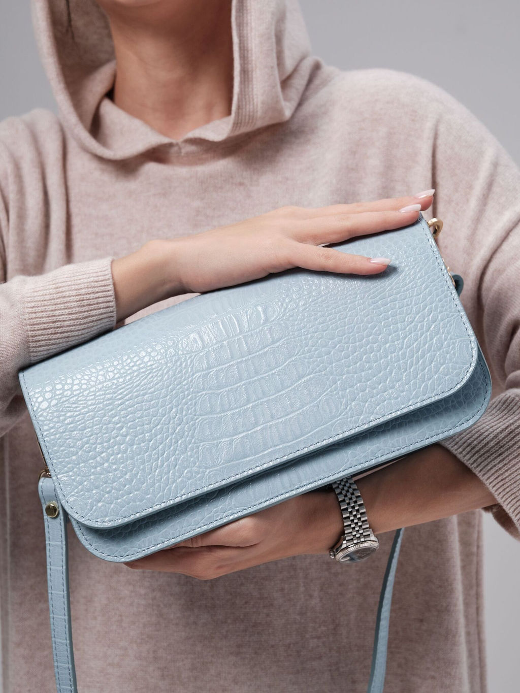 Женская сумка из натуральной кожи Deboro 30138 голубая вода крок станет вашим идеальным спутником в повседневной жизни. Изящный дизайн и высококачественные материалы делают ее не только модным аксессуаром, но и практичным решением для хранения ваших важных вещей. Внутри расположен карман на молнии для ценных вещей. Водонепроницаемая подкладка сбережет изделие от повреждений. Сумка выполнена из мягкой кожи, что обеспечивает приятные тактильные ощущения и долговечность. Средний размер позволяет легко разместить все необходимые вещи. Модель удобно носить через плечо как кросс-боди благодаря съемному регулируемому ремню. Также в комплект входит короткий съемный ремень для ношения на плече или ее можно носить как клатч без ремня. Натуральная кожа делает сумку износостойкой и легкой в уходе. Просто протирайте ее мягкой тканью, чтобы сохранить первоначальный вид и блеск. -- Характеристики -- Цвет: голубой Материал: Натуральная кожа Бренд: Deboro Тип: Сумка на плечо Страна-изготовитель: Россия Высота, см: 15 Ширина, см: 28 Глубина, см: 8 Материал подкладки: Хлопок Количество внутренних отделений: 1 Тип застежки: Магниты Формат А4: не вмещает Высота ручек, см: 21 Длина плечевого ремня, см: 116 Вес товара, г: 530 Ручки: На запястье;На локоть;На плечо;Плечевой ремень Пол: женская коллекция Группа товара: Сумки