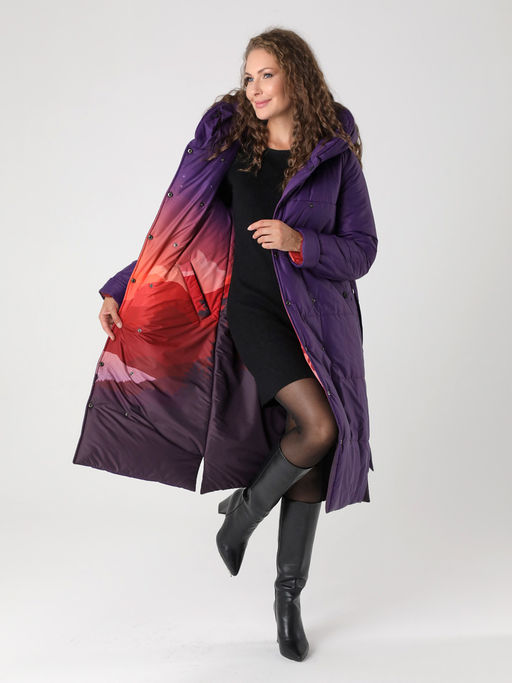 В таблице в карточке товара указаны обхваты тела (грудь/бёдра). Замеры самого изделия можно уточнить у организатора или посмотреть в таблице по ссылке https://disk.yandex.ru/d/es8gKDxRVaKAlQ Стильное двухстороннее пальто на кнопках прямого силуэта, с капюшоном и ярким акцентным принтом украсит гардероб девушек и женщин разных возрастных категорий. Прямой силуэт пальто можно скорректировать с помощью съемного завязывающегося пояса, акцентируя линию талии и создавая тем самым большее прилегание. Длина втачного рукава регулируется отворотом. На обеих сторонах пальто есть функциональные карманы. Плащевая ткань, из которой выполнено пальто, имеет водоотталкивающую пропитку, выдерживающую небольшой дождь или снег. Хорошо зарекомендовавший себя современный утеплитель с содержанием овечьей шерсти "Альполюкс", плотностью 300 г/м, защитит от холода и ветра. Сочетание в этом модном зимнем пуховике сдержанности и яркости поможет в создании различных образов! Выбирайте понравившееся цвет, меняйте аксессуары и обувь, и это пальто станет любимой вещью в Вашем гардеробе! Пусть зима будет не только комфортной, но и стильной! * Состав: 100% полиэстер * Подкладка: 100% полиэстер * Утеплитель: Alpolux 300 гр/м * Сезон: Зима * Производитель: Торговый Дом "ДиВэй", Россия * Артикул: 24406 * Температура комфорта от: -20 * Температура комфорта до: 0 акция