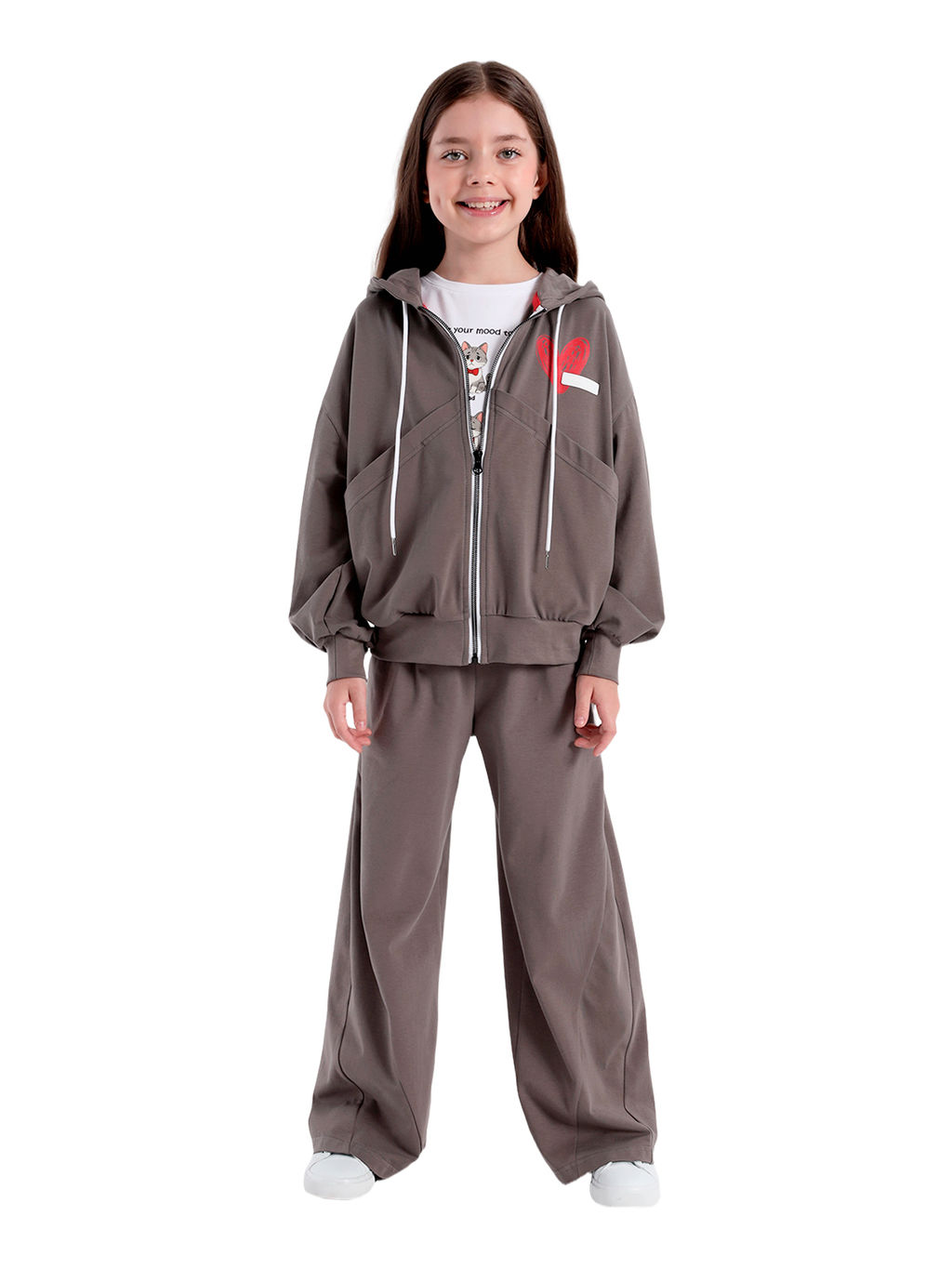 Джемпер из плотного трикотажа, спущенное плечо, на полочках большие накладные карманы, принт с нашивкой, застежка в виде молнии, длинные и широкие рукава с притачными манжетами, к низу изделия притачивается пояс, одношовный капюшон со шнурком.