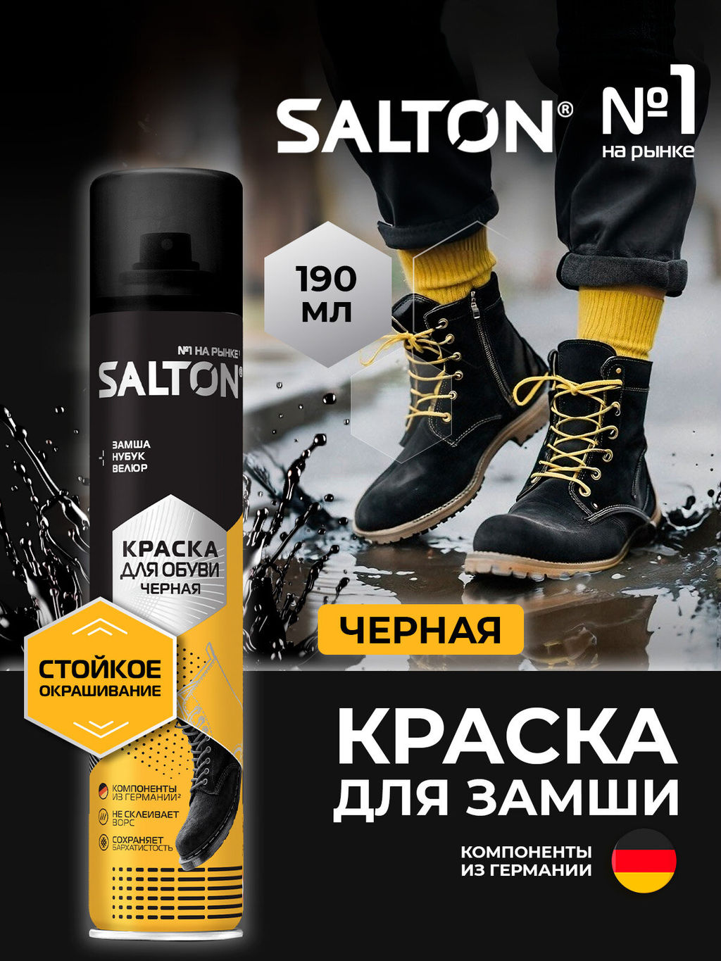 Благодаря специальным металлокомплексным красителям в составе, а также особой технологии распыления краска для замши, нубука и велюра Salton обеспечивает узконаправленное окрашивание в насыщенный черный оттенок.