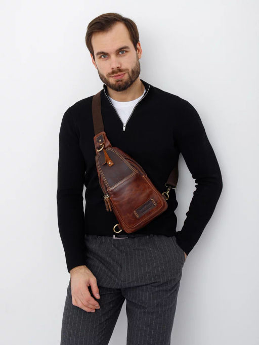 Рюкзак на одно плечо, выполнен из натуральной кожи. Дополнен серебристой темной фурнитурой. Данная модель закрывается на молнии. Носится на плече. Встроенный ремень перестегивается на одну или другую сторону.