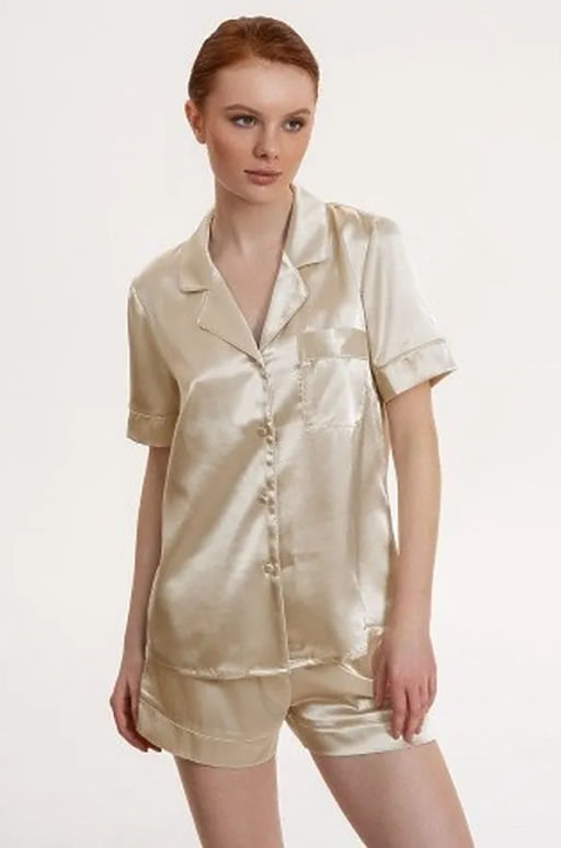 Комплект Mia-Mella состоит из рубашки с центральной застежкой на пуговицы с короткими рукавами и шорт. Комплект выполнен из искусственного принтованного шелка. Жакет и шорты оформлены кантом. Состав:100% полиэстер