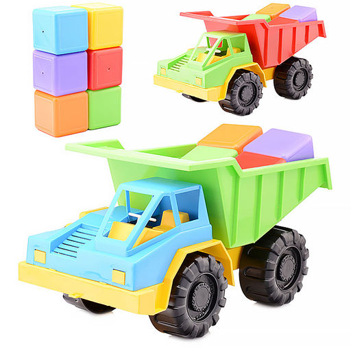 • В комплекте с грузовиком - набор из 6 разноцветных кубиков размером граней 8 см.