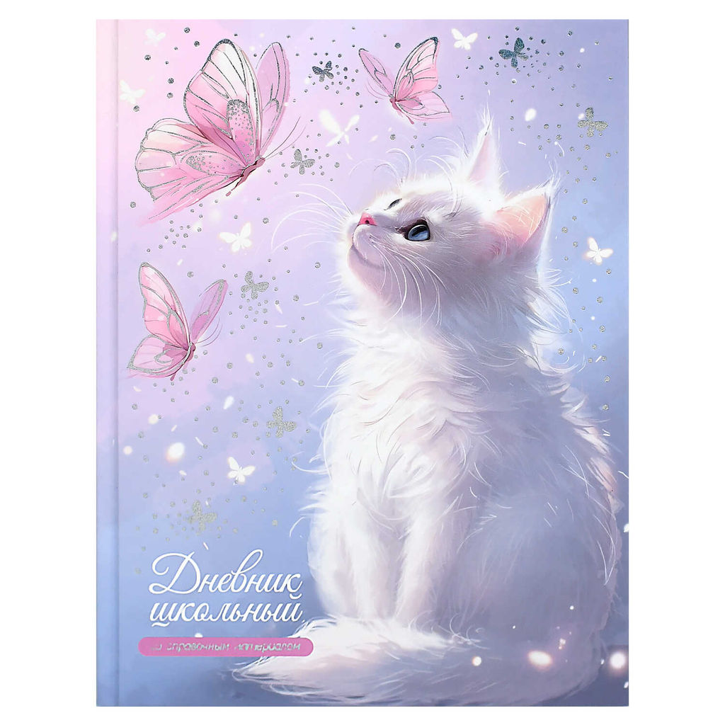 Дневник школьный арт. 72747 КОТ И БАБОЧКИ / твёрдый переплёт, А5+, 48 л., тиснение фольгой, глянцевая ламинация, печать в одну краску, универсальная шпаргалка/