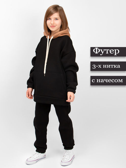 Джемпер свободного силуэта, с карманом кенгуру, с капюшоном. Брюки по талии на мягкой, широкой резинке. Плотный и эластичный трикотаж футер трёхнитка с начёсом хорошо пропускает воздух, не теряет формы, способен удерживать тепло. Отличный вариант для дома или прогулки в холодное время года.