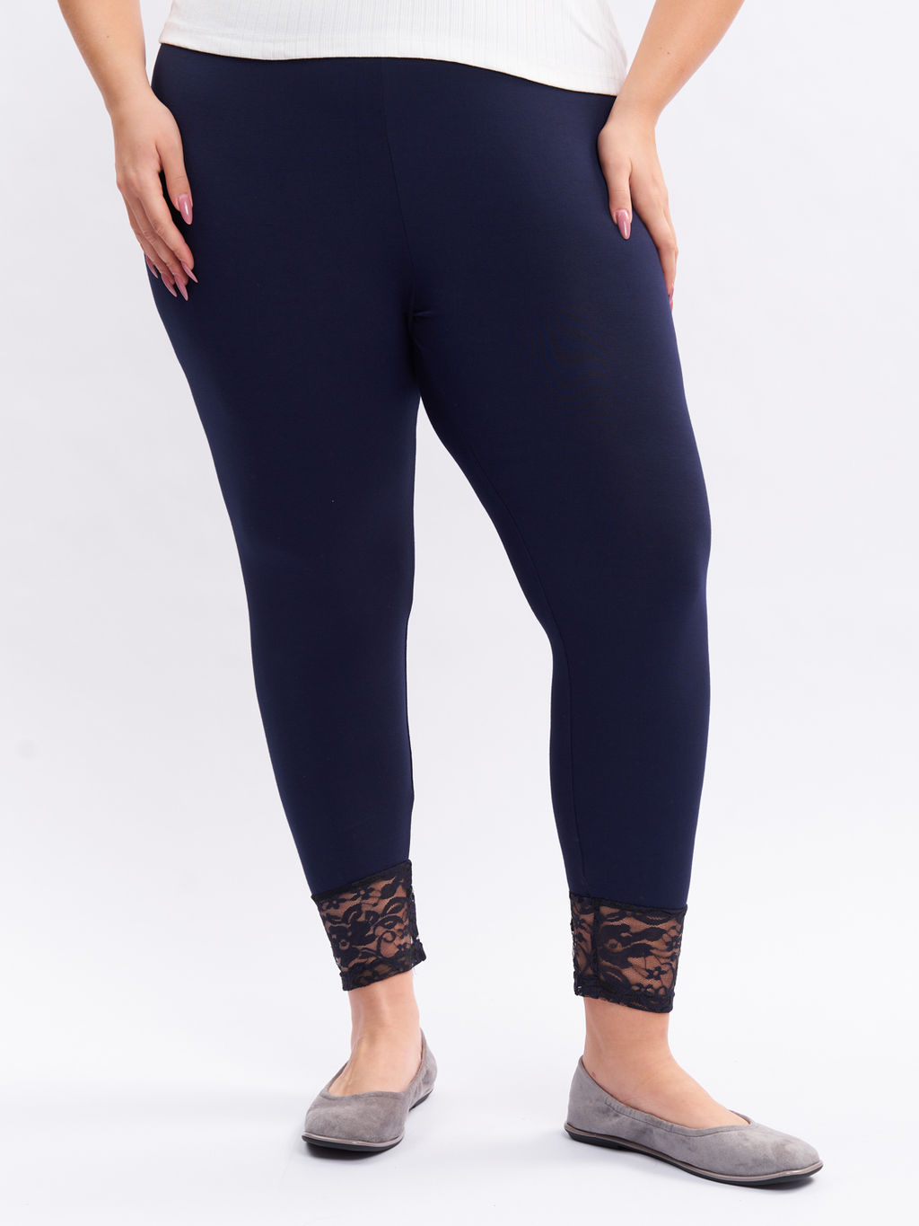 Низ модели украшен изящным гипюром, который придает леггинсам особую женственность и элегантность. Эти леггинсы изящно подчеркивают достоинства фигуры, подходя для образов в стиле плюс сайз.