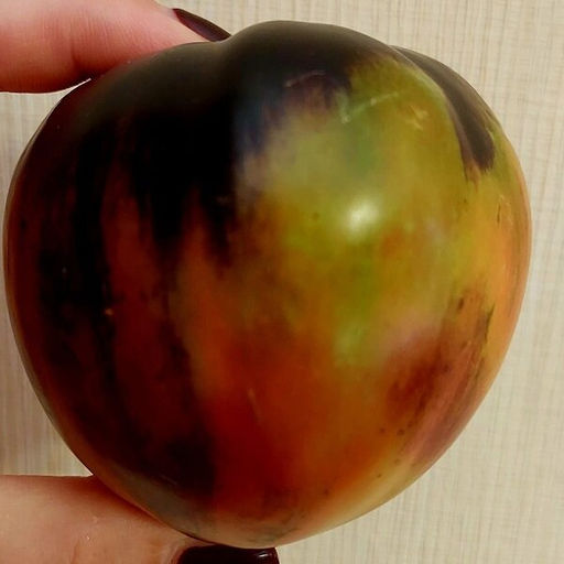 Просто шикарный томат.Высокорослый 1.8м. Среднеспелый с длительным плодоношением Плоды высоко плоскоокруглые, очень красивые. Каких только цветов нет и бордовый и и изумрудный и охровый и фиолетовый и все это с хорошим анто.переливается и светится, как неоновый. Вес плодов от 200 до 500 грамм вкус сладчайший с фруктовыми нотками Супер! Может расщепляться!