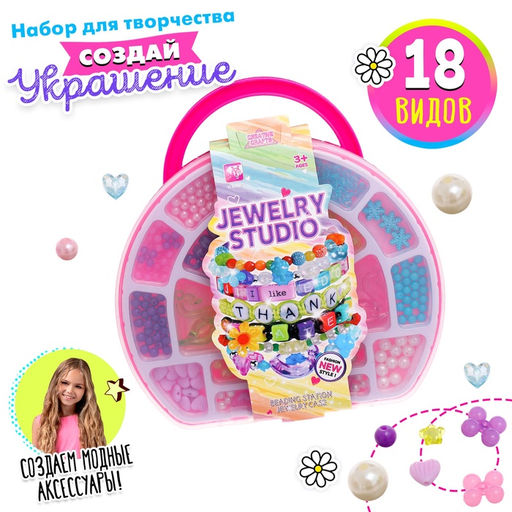 В коробке есть всё необходимое для творчества: бусины и подвески, из которых можно делать украшения в разных стилях.