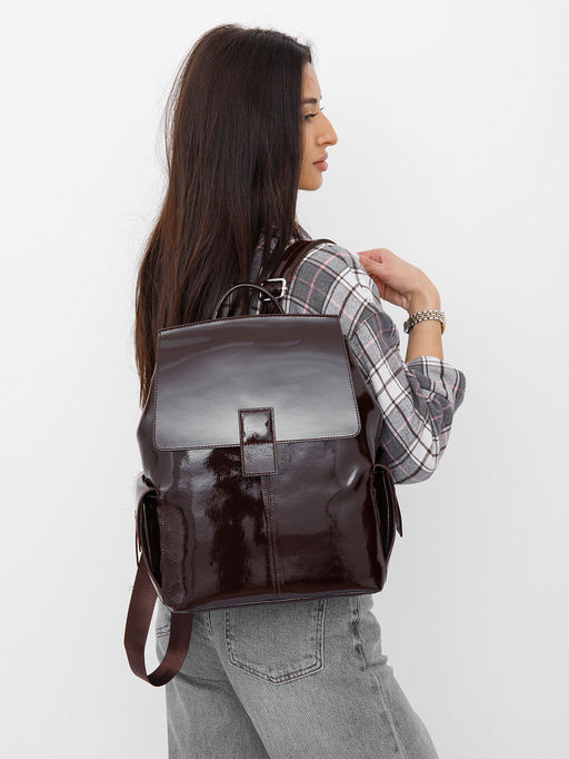 Удобный рюкзак, выполнен из натуральной лаковой кожи. Дополнен серебристой фурнитурой. Данная модель закрывается на клапан. Каркас полужесткий. Рюкзак носится в руке или на плече. Встроенный ремни регулируются по длине.