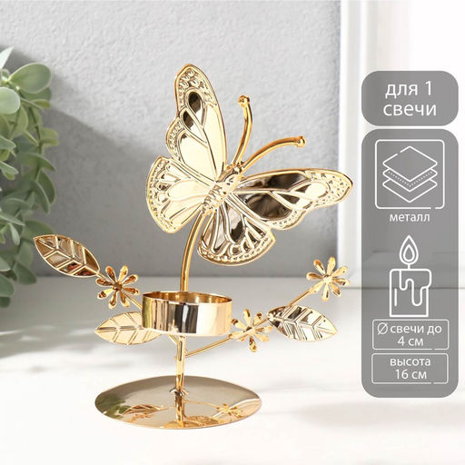 Металлический подсвечник на 1 свечу d=4 см Бабочки в поле, золото, 7.7?14?16 см