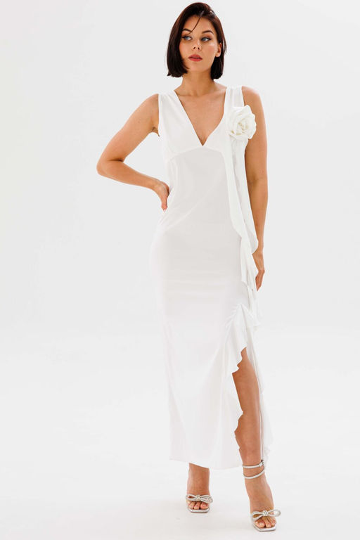 Платье в длине миди, выполнено из шелка армани, лиф отрезной, по переду сбоку обработан вырез с воланом. Застежка - потаная молния в боковом шве. Декор в виде цветка с воланами отстегивается.­