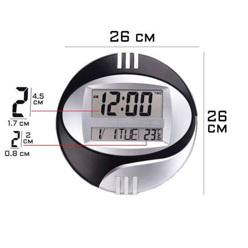 Электронные часы – это и современный многофункциональный гаджет, и оригинальный интерьерный аксессуар, который может стать отличным подарком для ребёнка или взрослого. Удобные часы будут идеальным спутником в вашей повседневной жизни. Они подарят вам не только точное отображение времени, но и такие дополнительные функции, как будильник, календарь, термометра и секундомера. Благодаря термометру вы всегда будете знать, как создать оптимальный микроклимат для комфорта и здоровья, календарь не даст забыть о важных мероприятиях, а будильник станет проводником в комфортное, спокойное утро без бесконечных пробуждений. Благодаря небольшим размерам, их удобно разместить на столе или прикроватной тумбочке, также их можно повесить на стену. Электронные часы послужат отличным подарком маме, бабушке, папе, брату, сестре на 8 марта, 23 февраля, новый год и любой другой без исключений праздник. Тип питания: От батареек. Форма: Круглая. Размер, см: 26 х 26. Вид установки: Настенный (навесной). Вид установки: Настольный. Подсветка: Нет. Особенности: С будильником. Особенности: С календарём. Особенности: С термометром. Особенности: С секундомером. Размеры товара: 3/26/26.