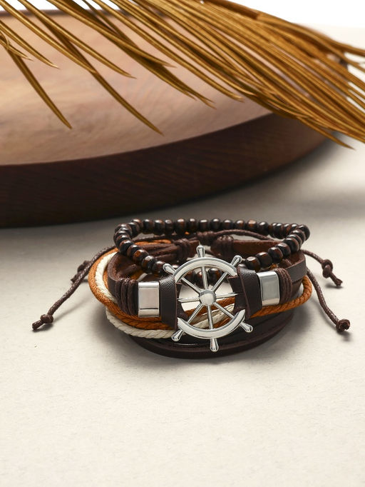 Набор браслетов кожаных «Мачта и штурвал», 3 шт., бежево-коричневый в серебре, d=7.5 см