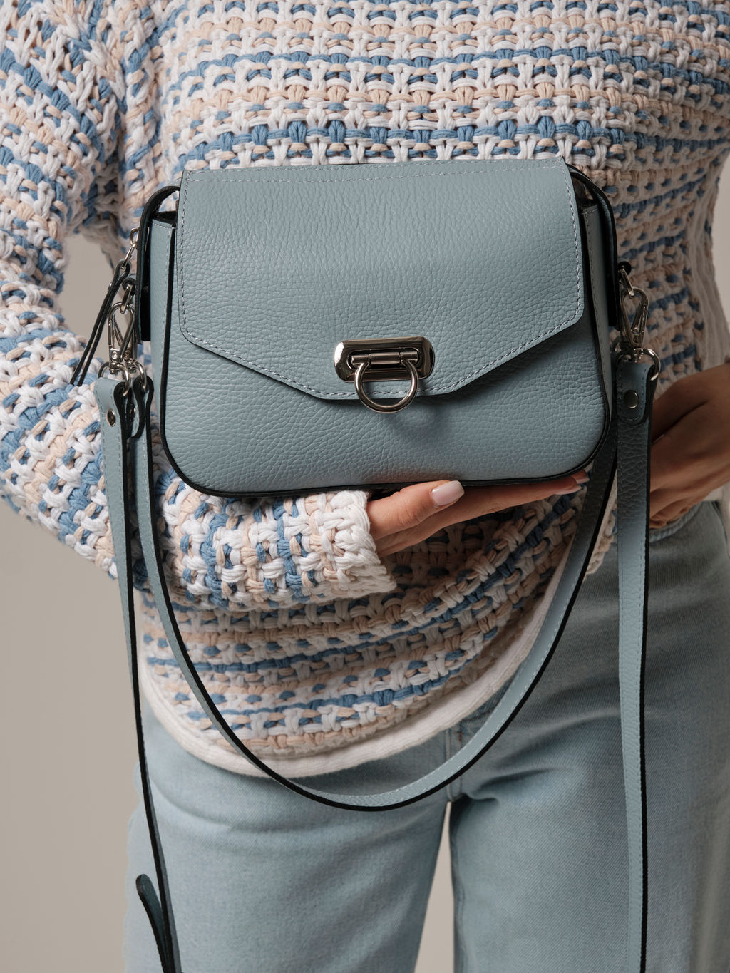 Эта женская сумка выглядит очень актуально: лаконичный дизайн, плавные линии, аккуратный клапан с декоративной пряжкой - всё это делает ее универсальной. Универсальный серо-голубой цвет легко вписывается в любой гардероб и сочетается с разной цветовой гаммой.