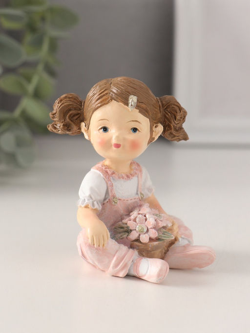 Фигурка полистоун «Малышка с хвостиками, с цветами в горшочке», розовый, 6×5.5×7.5 см