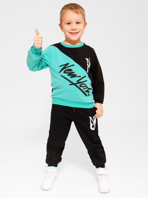Спортивный костюм для мальчика из натурального хлопка - футера. Кофта комбинированная с принтом. Брюки на широком эластичном поясе с кулиской, брючины на манжете. Стильный, удобный костюм подходит для прогулок и активного отдыха.