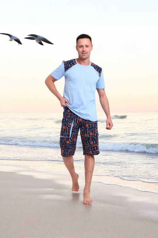 Погрузись в атмосферу свободы и летнего беззаботного отдыха с этим стильным мужским костюмом! Легкая футболка нежно-голубого цвета с оригинальными контрастными вставками на плечах — это не просто одежда, а настроение.Костюм идеально подойдёт для отдыха на пляже, летней вечеринки или просто уютного дня дома. Свободный крой, приятная к телу ткань и яркий дизайн делают его настоящим must-have сезона.Выразительный дизайн, который притягивает взгляды, мягкий трикотаж, дарящий комфорт с утра до вечера, универсальность — для дома, дачи, моря или прогулки, карманы в шортах для практичности, отлично сочетается с пляжными сандалиями или кедами.