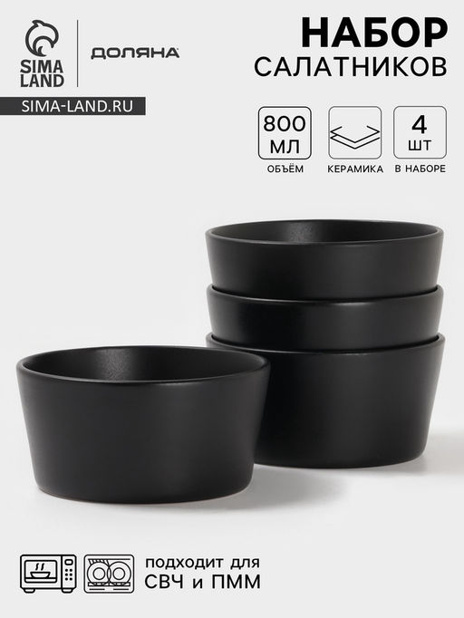 Набор керамических салатников 4 шт — стильное решение для сервировки. Чёрные круглые миски диаметром 14,5 см идеально подходят для любых блюд.Технические особенностиЁмкость каждой миски — 800 млСтенки высотой 7 см удобны для смешиванияГладкая керамическая поверхностьМатовый чёрный цвет без рисунковПрактические преимуществаМожно разогревать в микроволновкеДопускают мытьё в посудомоечной машинеПодходят для горячих блюдКомплект заменяет несколько отдельных ёмкостейРекомендованное использованиеСервировка салатов на праздникахПорционная подача гарнировПриготовление холодных закусокХранение продуктов в холодильнике Набор: Да. Диаметр, см: 14.5. Объём, л: 0.8. В наборе, шт.: 4. Объём, мл: 800. Тематика: Однотонная. Рисунок: Нет. Крышка: Нет. Можно мыть в посудомоечной машине: Да. Можно использовать в СВЧ-печи: Да. Текстура: Гладкая. Особенности: Без особенностей. Для горячего: Да. Бесплатная доставка: Да. Размеры товара: 14.5/7/14.5. Примечание: Оттенок данного товара может незначительно отличаться от фото/видеоизображения (в зависимости от настроек яркости вашего экрана)..