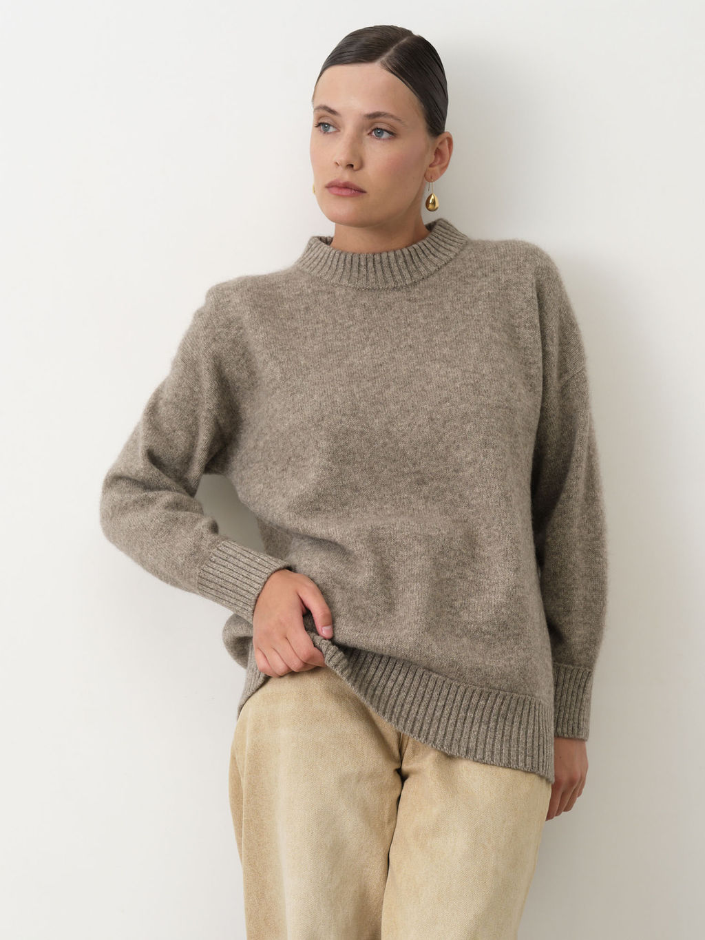Классический оверсайз джемпер из 100% пуха яка в сером цвете. Серый цвет является редким оттенком натурального пуха яка и высоко ценится любителями теплых вещей. Эта модель плотная, не рыхлая, манжеты в рельефную вязку. Джемпер прекрасно дополнит любой гардероб, станет "выручалочкой" в ситуации, когда не знаешь, что надеть в прохладную погоду. В комплект к джемперу можно также приобрести штаны из пуха яка, но также его легко сочетать с брюками, юбками и джинсами из любой ткани.