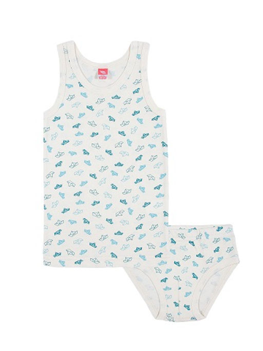 Комплект из трусов и майки. Горловина и проймы майки обработаны окантовкой из гладкого полотна в цвет основы. Верх трусов обработан плоским швом вподгибку с одновременным прокладыванием резинки. Проймы ножек обработаны окантовкой из основного полотна.