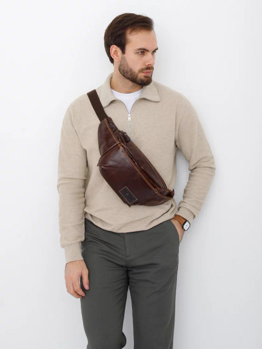 Мужской рюкзак на одно плечо, выполнен из натуральной кожи. Дополнен темной серебристой фурнитурой. Данная модель закрывается на молнию. Каркас полужесткий. Встроенный ремень перестегивается и регулируется по длине.