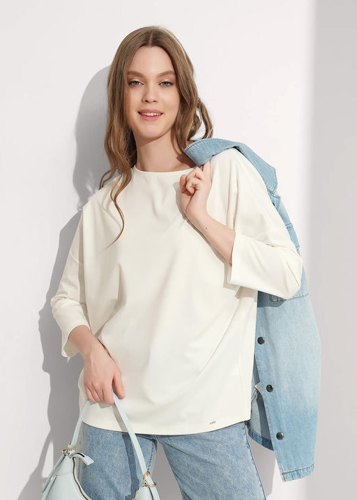Джемпер прямого свободного кроя из трикотажного полотна интерлок. Спущенная линия плеча, длинный рукав. Округлая горловина с внутренней окантовкой. Спереди металлическая нашивка. Состав:
