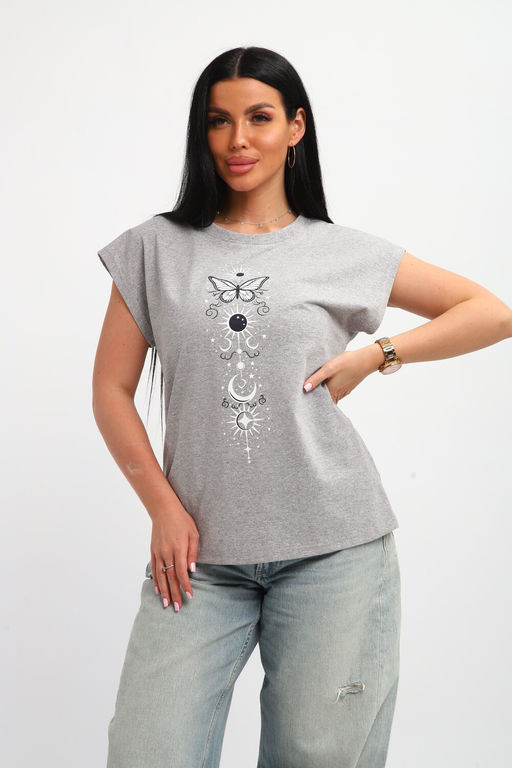 Футболка женская, изготовлена из меланжированного трикотажа. Горловина круглой формы, плечо спущено, без рукава. Низ изделия прямой. На полочке эффектный принт, выполненный методом шелкографии.