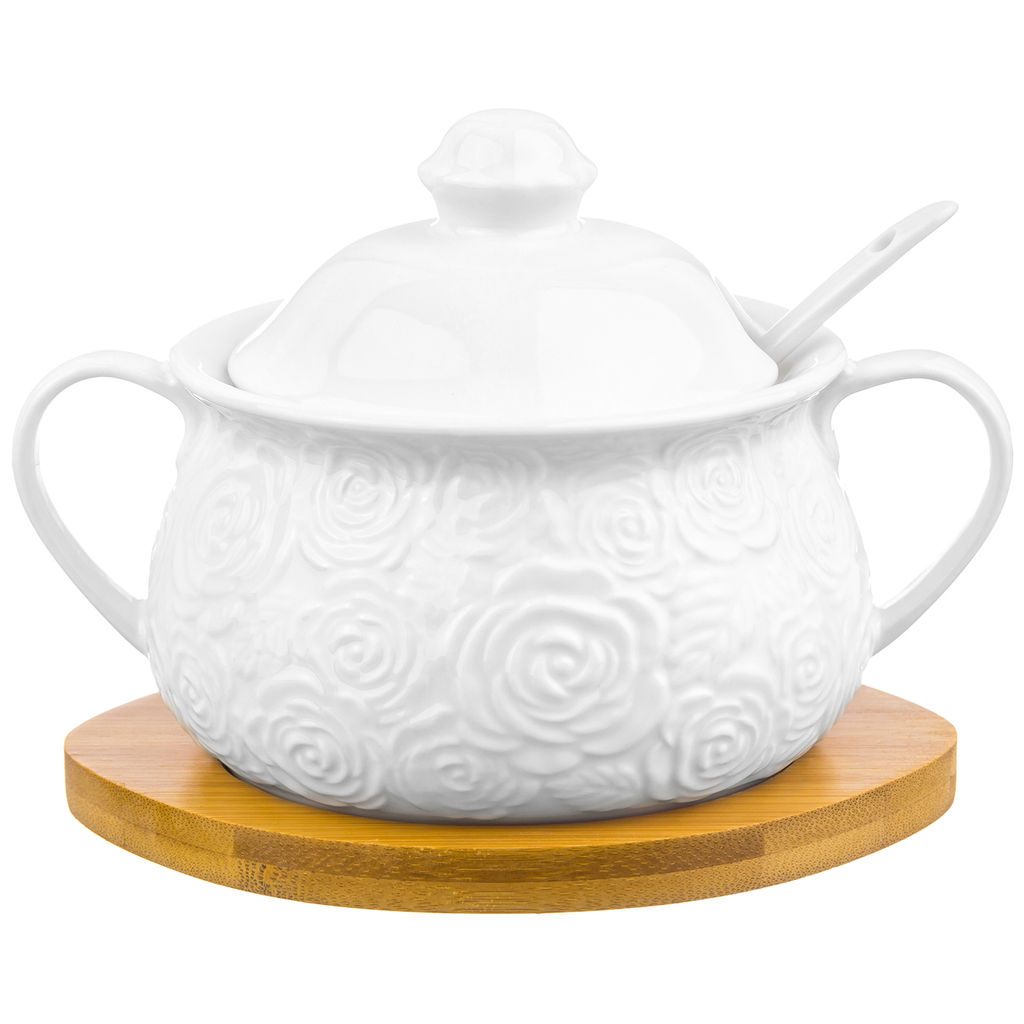 • Сахарница 400 мл 15,3*11,5*10,5 см "Розы" с ложкой и крышкой на дер. подставке