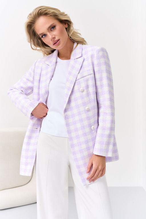 Двубортный классический жакет на подкладке, выполнен из костюмного полотна с актуальным дизайном, в основе которого лежит клетка Gingham. Модель полуприлегающего силуэта с лацканами ласточкино крыло и длинными рукавами со шлицей. Для удобства в носке спереди предусмотрены прорезные карманы с клапаном. Длина изделия по спинке 72см.; длина рукава 62см.