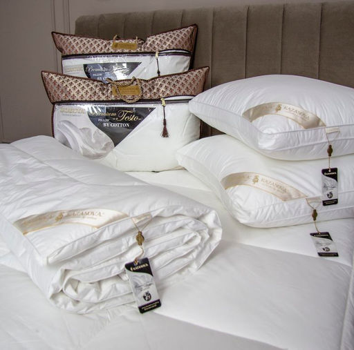 Коллекция подушек и одеял Premium "Testo"! Выполнена в сатиновом чехле плотного плетения, 100% хлопок, как в дорогих отелях, по очень привлекательной цене!!! Элементами отделки служат: бордюрная лента с хлопковым кантом и жаккардовая лента на углу с логотипом компании KAZANOV.A. Наполнитель: 40% шёлк (древесный) 60% микрогель, обработанный ионами серебра, имеющий  ряд преимуществ: гипоаллергенный, не комкуется и сохраняет форму, обладает высокой воздухопроницаемостью и является антистатическим изделием. Сатиновая текстура чехла создает все условия для комфортного сна, поможет вам избавиться от бессонницы, хорошо выспаться и накопить энергию на будущий день. Упаковка: подушки 50*70, 70*70 в жаккардовой сумке  с витыми шелковыми ручками. Одеяла : 155х210 , 200х220 в подарочных коробках с витыми шелковыми ручками.