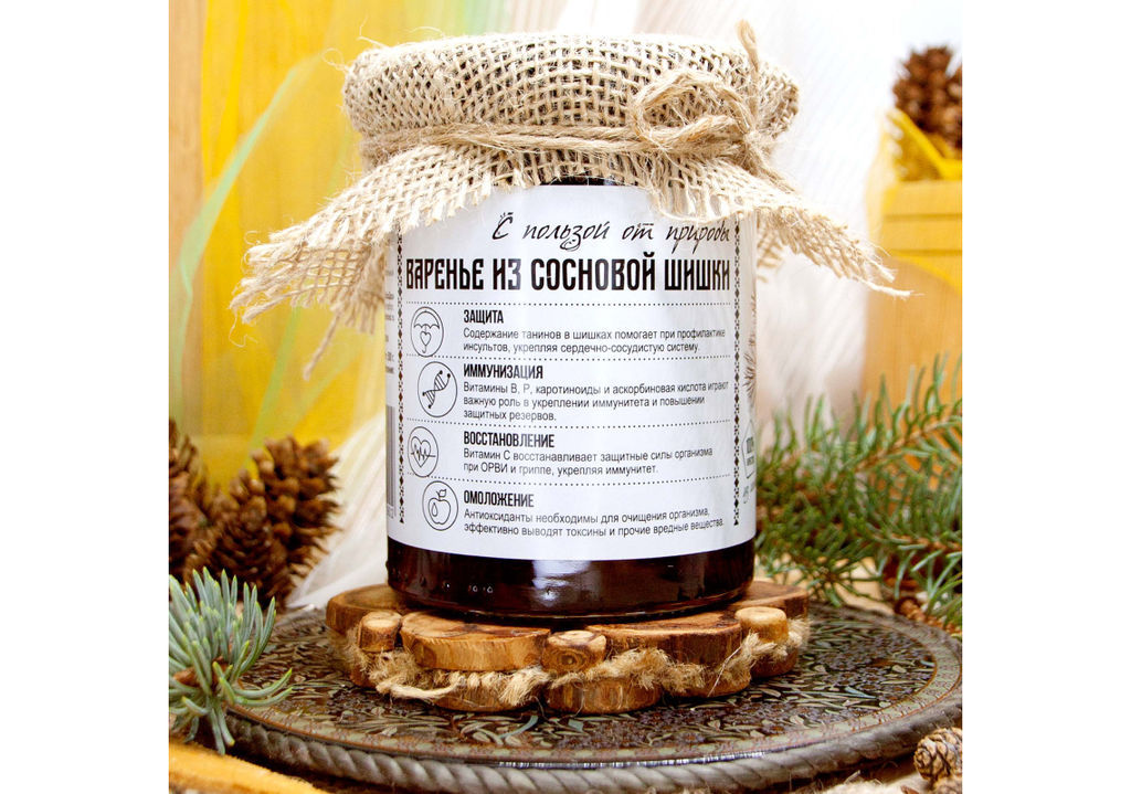 Описание товара Варенье из сосновых шишек обладает удивительным, запоминающимся, ярко выраженным вкусом, и несет в себе всю пользу плодов Карельского леса. Наше варенье приготовлено по старинным русским рецептам из молодых сосновых шишечек, которые можно есть! Мы гордимся его натуральным составом, ведь наше варенье из сосновых шишек сделано без консервантов и загустителей. Этот полезный продукт богат витаминами и будет отличным подарком для всей семьи. Это варенье - необычный, но очень оригинальный десерт, который не только вкусен, но и полезен для нашего организма.