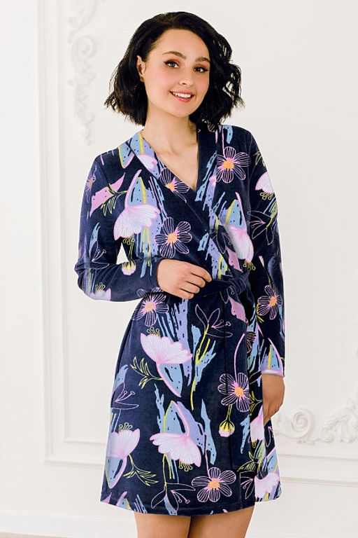 Удобный и очень лаконичный халат из хлопкового велюра, изысканного оттенка индиго деликатно дополнит Ваш домашний образ.