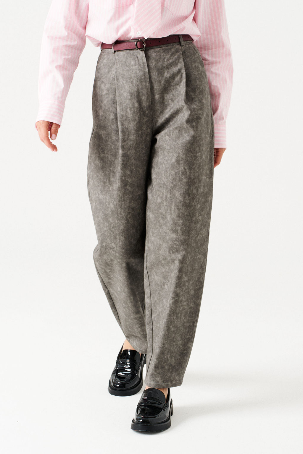 Брюки-бананы женские, свободные, слегка зауженные книзу. На передних половинках заложены складки, направленные в сторону боковых швов, боковые карманы с отрезным бочком. Застежка брюк гульфик на молнии. На задних половинках талиевые вытачки. Пояс притачной со шлевками, застегивается на пуговицу. Состав: 100% хлопок