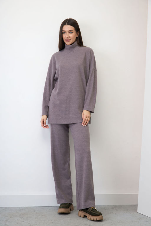 Комплект из уютного мягкого трикотажа, состоящий из свободного покроя оверсайз джемпера и широких свободных брюк. Джемпер имеет спущенную линию плеча, свободный рукав, зауженный к низу. Ширина рукава 22-24 см, запястья 15 см. Длина от линии горловины до запястья 72-74cm (B зависимости от размерного ряда). Боковые швы джемпера дополнены разрезами, высотой 15 см. Длина изделия по линии спинки 72-74 см(в зависимости от размерного ряда). Горловина джемпера оформлена стойкой с перегибом, высотой 8 см.