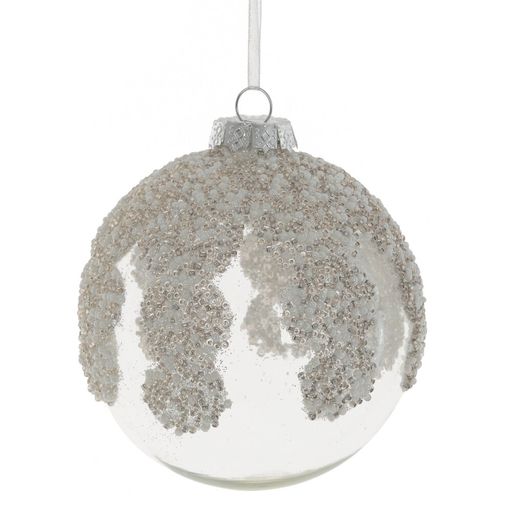 Новогодний прозрачный елочный шар украшен бисером снаружи и тонкой гирляндой из серебряных звездочек внутри. Будет чудесно смотреться на хвойных веточках ели.