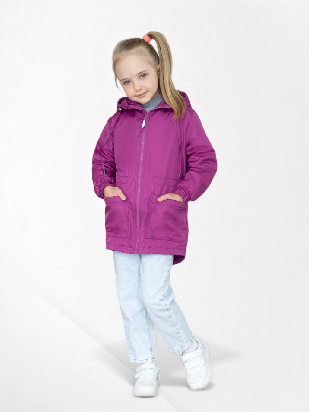 Детская ветровка свободного кроя на флисе для весны и лета цвета фуксии. Флисовая подкладка по всему изделию: в рукавах, и капюшоне. Застегивается на молнию. Высокий воротник, клапан для защиты от бегунка, внутренняя ветрозащитная планка. По талии кулиска для регулирования объема, фиксатор расположен на спине. Капюшон объемный, регулируется шнурком с фиксаторами. На рукаве светоотражающая нашивка, по низу резинка.