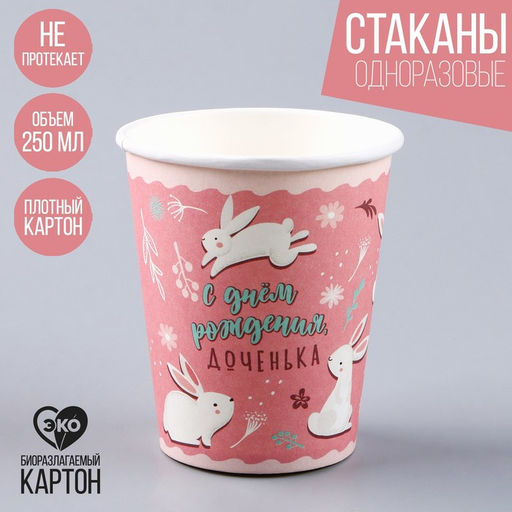 • Цена за 10 шт. Стакан одноразовый бумажный "С Днём Рождения, доченька", 250 мл