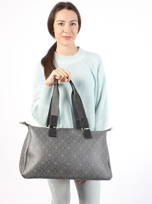 Сумка выполнена из экокожи канва. Детали: 2 ручки по 60см., 1 длинный регулируемый ремень на карабинах.  Внутри изделия: 1 отделение на молнии, 1 карман на молнии, 1 карман открытый. Снаружи изделия: 1 карман на молнии с оборотной стороны изделия. Брендированная подкладка из хлопка. Металлическая брендированная фурнитура золотистого цвета.­