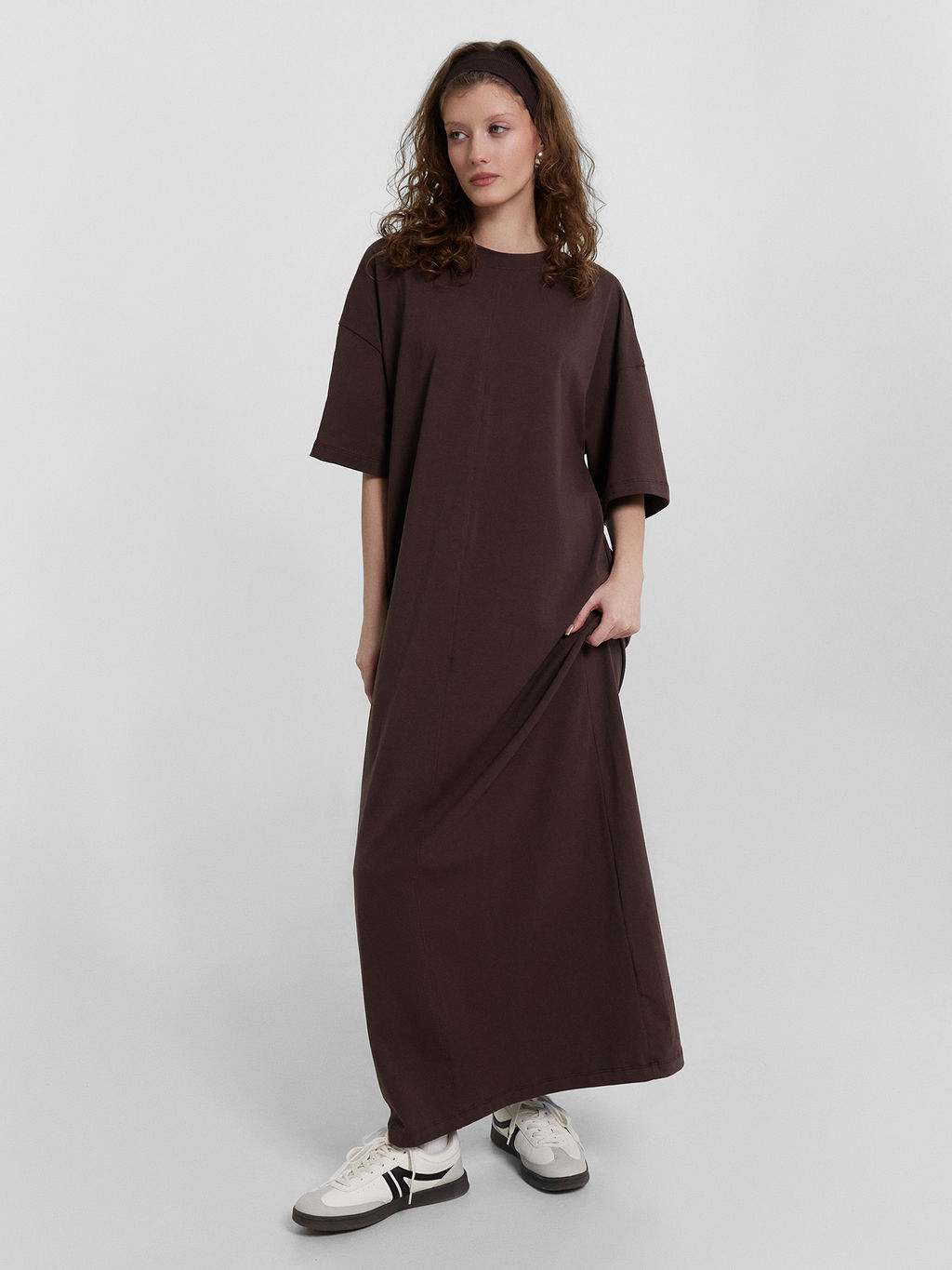 Платье свободного силуэта длиной макси отличный выбор для тех, кто ценит комфорт и стиль. Круглая горловина и короткие рукава с углубленной проймой создают элегантный и непринужденный образ. Нижние срезы платья и рукавов обработаны швом вподгибку, что придает изделию аккуратный и завершенный вид. Модель выполнена из хлопка с небольшим содержанием эластичных волокон, что обеспечивает приятное ощущение на коже и легкую эластичность для дополнительного комфорта. Этот материал также позволяет коже дышать, что делает платье идеальным вариантом для теплых дней или расслабленных вечеров.­