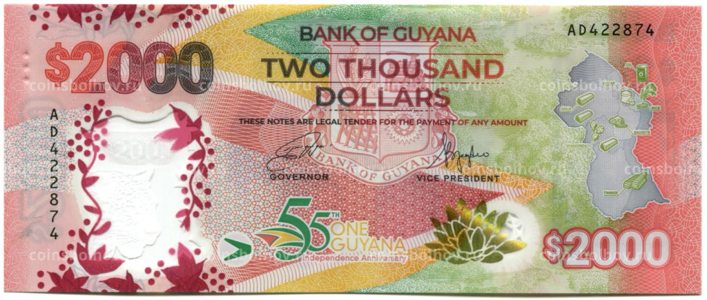 • Банкнота 2000 долларов 2022 года Гайана  55 лет Независимости