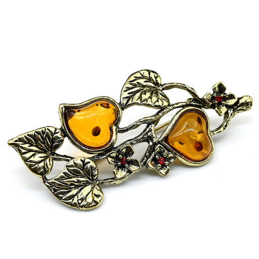 Брошь с янтарем в бронзе "Сердечки" 29*64мм коньячный