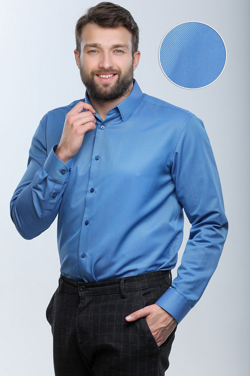 Приталенная классическая рубашка с длинным рукавом из однотонной ткани с выработкой синего цвета, с классическим воротником. Силуэт regular fit.
