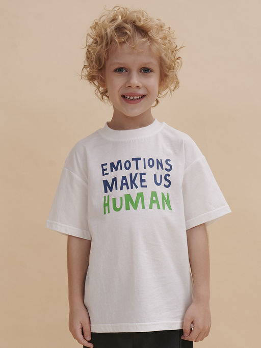 Маркированный товар Состав: 100%хлопок Футболка для мальчика оверсайз модель большого объема на каждый день, для дома и прогулок. Легкая трикотажная футболка подходит в качестве нательного белья и многослойных образов. Базовая футболка на любой сезон. Изделие сшито из 100% натурального хлопка. Футболка детская для мальчика из мягкого материала приятно прилегает к телу, не вызывая дискомфортных ощущений во время движений. Хлопок хорошо пропускает воздух, обеспечивает гигроскопичность. Материал не задерживает влагу - ребенок не потеет. Оптимальный размер горловины удобен в носке - позволит ребенку с легкостью надевать и снимать ее самостоятельно. Футболка для мальчика прослужит долго и будет радовать износостойкостью. Модель представлена в белом цвете. Белая футболка для мальчика - оптимальный вариант на любой выход. Футболка для мальчика с принтом спереди украшена надписью "Emotions make us human" перевод "Эмоции делают нас людьми". Изделие привлекает интересным дизайном - принтом сзади. Свободная футболка для мальчика подростковая рассчитана на возраст садика и школы. Размерная линейка: 1 (86); 2 (92); 3 (98); 4 (104); 5 (110); 6 (116); 7 (122); 8 (128); 9 (134); 10 (140); 11 (146). Крутая футболка для мальчика отличный подарок для сына, внука, братика, племянника, крестника! Выбирайте нужный размер по таблице размеров на фото. Цвет товара на экране вашего устройства может отличаться от цвета изделия вживую.