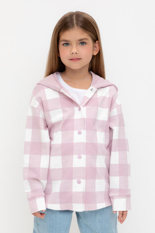 Свободная трикотажная рубашка для девочки с капюшоном. Выполнена из мягкого петельчатого футера. Застёгивается на кнопки. Модель с закругленным низом и спущенным плечом. По бокам разрезы.. Состав: 100% хлопок
