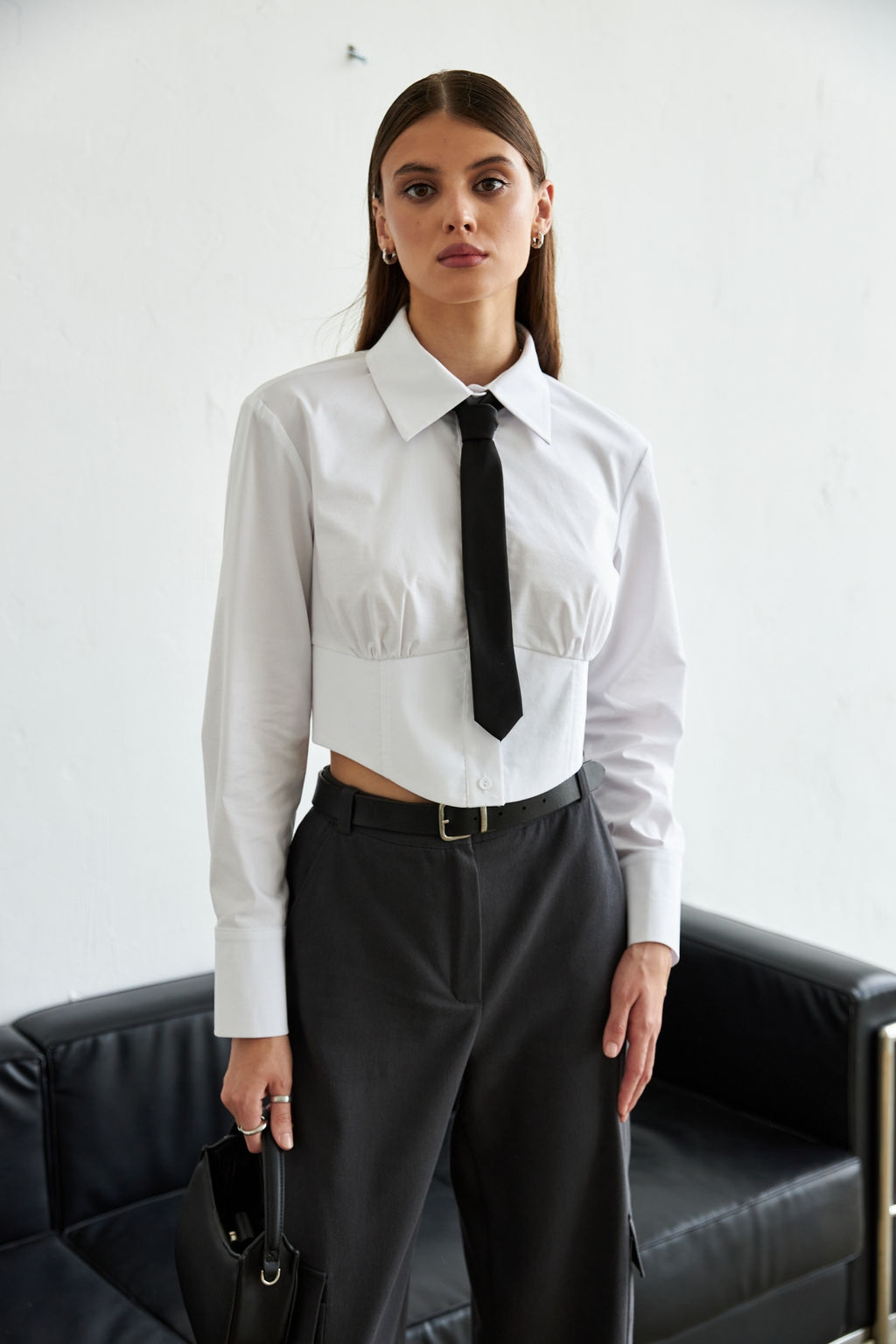 Укороченная блуза-рубашка из хлопкового полотна. Модель приталенного силуэта с фигурным подрезом и сборкой под линией груди. Застежка на пуговицу и петли и фигурный низ изделия по переду.­
