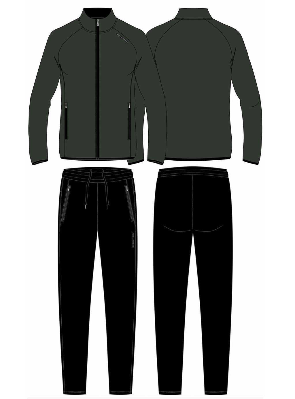 Костюм изготовлен из легкой плащевой ткани. Куртка на молнии прямого силуэта с воротником-стойкой, без подкладки. Крой рукавов - реглан, на рукавах контрасные вставки в цвет брюк. В боковых рельефах выполнены удобные карманы с контрасной планкой, с молниями. Низ рукавов и низ куртки окантованы эластичной тесьмой. Брюки прямого силуэта, без подкладки. Спереди на брюках прорезные карманы с планками, так же застегиваются на молнию. Низ брюк слегка заужен эластичной тесьмой. Пояс брюк выполнен с широкой эластичной резиной, дополнительно фиксируется шнуром. На груди куртки справа и под правым карманом брюк - шеврон с фирменным логотипом.