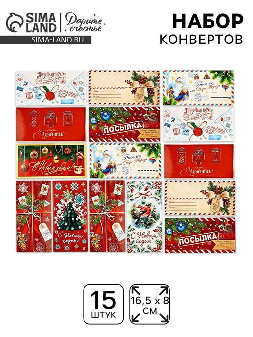 • Набор конвертов для денег «С Новым годом», 15 штук, 16.5×8 см