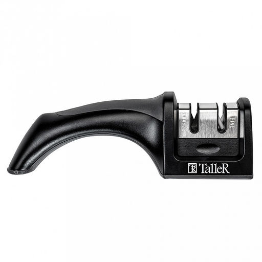 Точилка для ножей "Дженнис" 19,1х5,1х6,4см, 2-х ступенчатая заточка, модуль заточки Coarse из стали, модуль шлифовки Fine из керамики, угол заточки: 20гр, пластмассовый корпус, силиконовый протектор, в блистере, "TalleR"