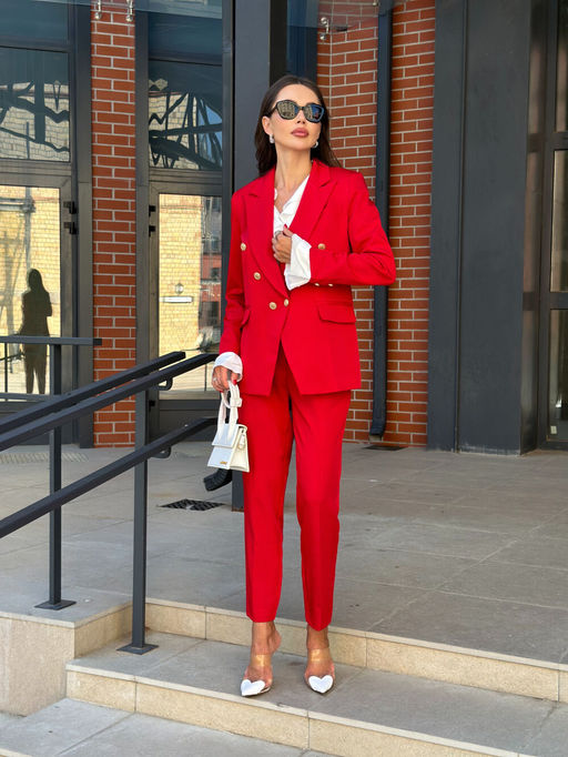 Костюм 2-предметный: жакет и брюки. Двубортный жакет на подкладке, прямого силуэта. Обработаны прорезные карманы по переду. Рукава втачные одношовные, обработаны шлицей.  Брюки прямого кроя, длинна 7/8, застёжка- гульфик , по юоковым вам обработаны карманы­